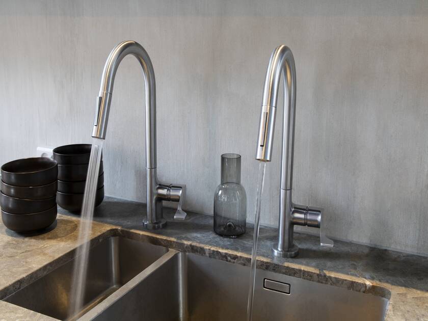 Through choice of material and palette, each hotel room evokes a different mood, a different landscape. AXOR Uno harmonizes with all of them, whether in Brushed Black Chrome for a ‘lunar’ ambience or in Brushed Bronze for a ‘deep forest’ atmosphere. Other finishes include Brushed Brass and Stainless Steel Optic. In addition to AXOR Uno, the rooms are equipped with AXOR Showers products such as the overhead shower 350, which offers the cocooning PowderRain spray type. The penthouse rooms feature lavish shower products such as the AXOR ShowerHeaven. Downstairs, the kitchen boasts AXOR Citterio kitchen mixers in the eye-catching semi-pro variant.