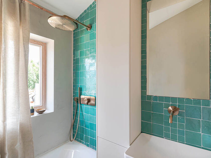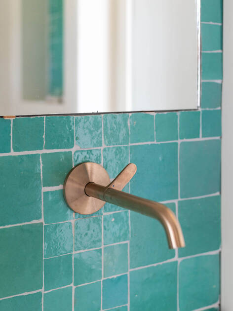 Blending minimalist design with Arabic influences, the bathroom is a serene, light-laden place in which to wash and unwind. Hammam-inspired tiling covers the floor while handmade Moroccan wall tiles bring a vivid turquoise to the washbasin area. Complementing the cool tones of the bathroom and enhancing its natural atmosphere are a faucet and baton hand shower from the AXOR One range, both finished in Brushed Bronze, one of the exclusive AXOR FinishPlus surfaces. With their reduced and timeless form, the fixtures perfectly embody the essentialist ethos of the Tiny House.
