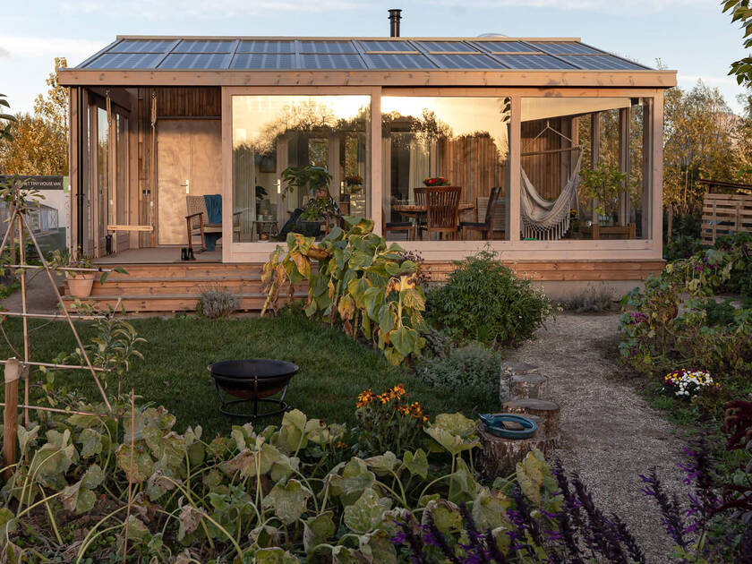 Right down to its construction material—sustainably-sourced, fast-growing wood—every aspect of the Tiny House was planned to minimize ecological impact and foster a deep connection with nature. The home runs entirely on solar power and is able to store and recycle up to 4500L of rainwater, which is used to flush the toilet and for washing clothes. Outside, Marjolein tends to an organic subsistence garden filled with a wide variety of fruit trees, flowers and vegetable plants that attract local birds and insect species.